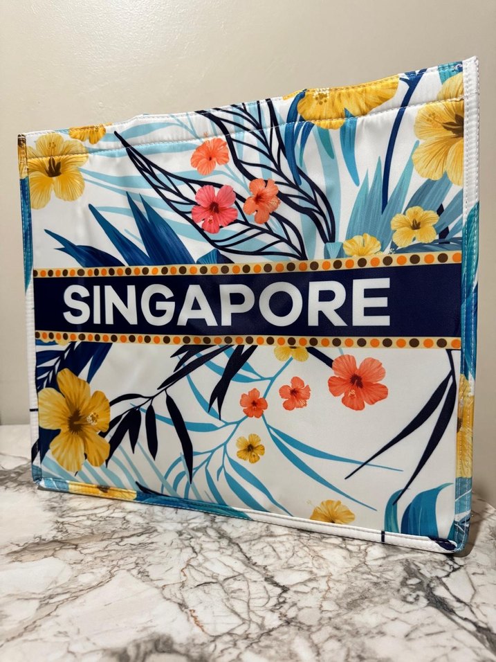Canlı renklerde baskılı kadın clutch çanta, sentetik kumaştan ve fermuarlı. Günlük kullanım için uygun, bohem ve retro sokak stiline uyumlu. Önünde "SINGAPORE" yazısı bulunur.
