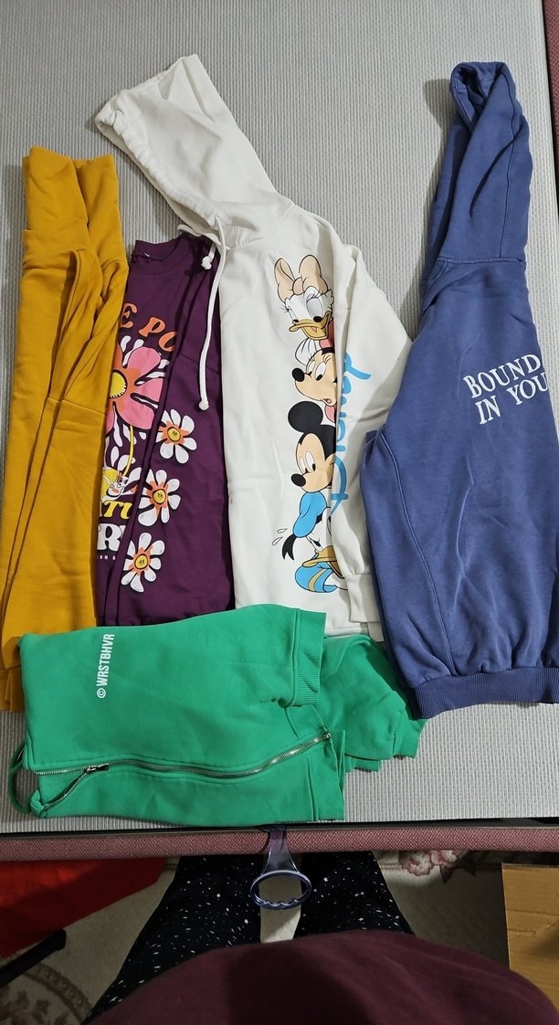 Renkli baskılı, pamuklu, kapüşonlu kadın sweatshirt. Uzun kollu, bol kesim ve fermuarlı detaylarıyla günlük rahat kullanıma uygundur. Kusurlar fotoda gösterilmiştir , hepsinin fiyatıdır
