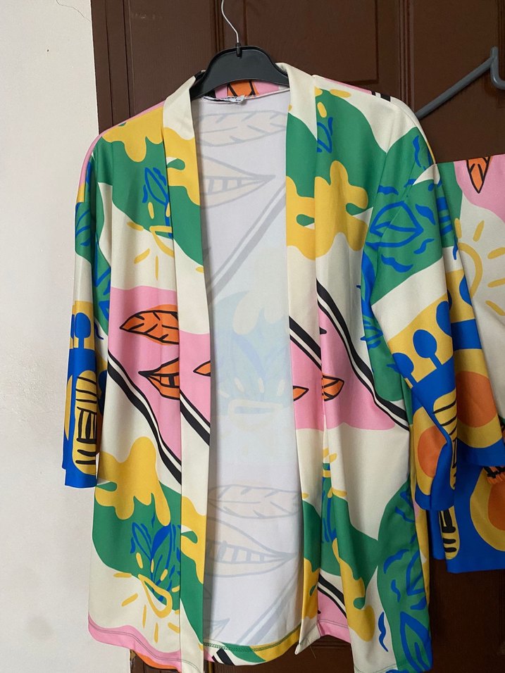 Renkli baskılı, sentetik kumaştan, uzun kollu ve bol kesim kadın kimono. Drapeli tasarımı ve straplez yakasıyla bohem ve retro tarzı yansıtıyor.