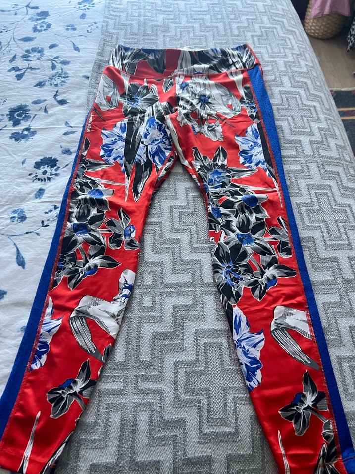 Renkli baskılı, elastik bel bantlı, midi boy, dar kesim kadın kumaş pantolon. Günlük kullanım için uygun, sokak modasına uygun tasarım. Nike’ın ürünüdür
