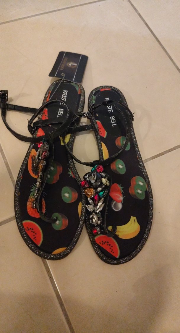 Kadınlar için , renkli baskılı ve tokalı kauçuk sandaletler. Bohem tarzı ve romantik akşamlar için uygundur.
