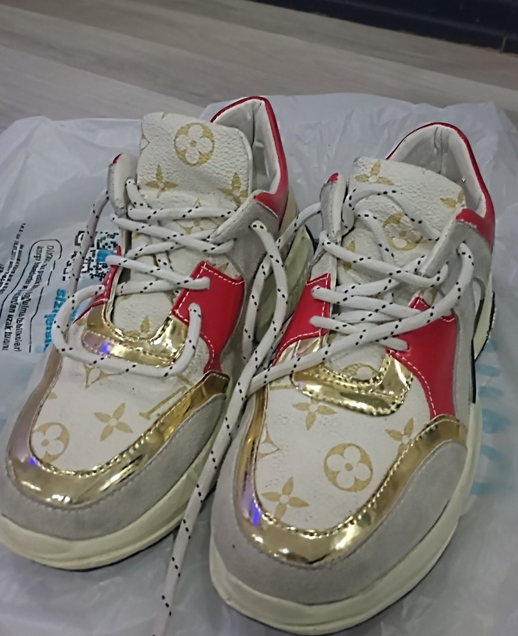 Kadın spor ayakkabısı, renkli baskılı ve bağcıklı. Kauçuk malzemeden, dolgu topuklu ve spor şıklığı yansıtır.