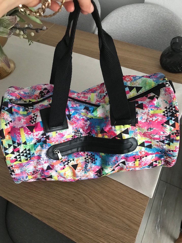 Sentetik kumaştan, renkli baskılı ve fermuarlı bölmeleri olan kadın spor çantası. Sokak modası ve athleisure tarzına uygun.