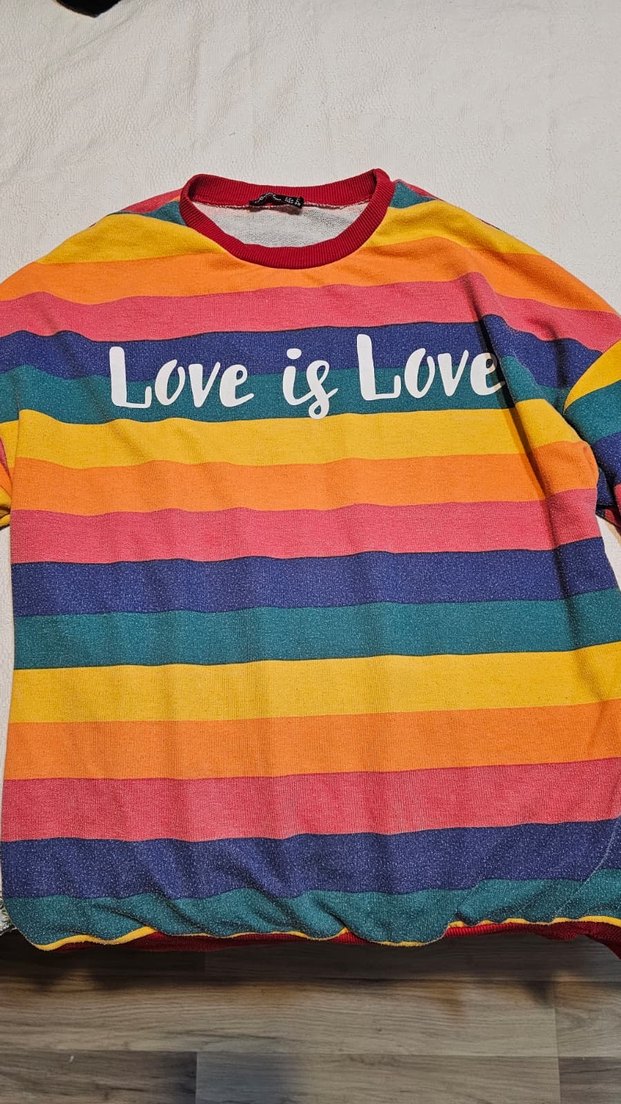 Renkli yatay çizgilerle uzun kollu, bol kesim kadın sweatshirt. Bisiklet yaka ve örgü dokusu bulunur. Üzerinde "Love is Love" yazısı vardır.