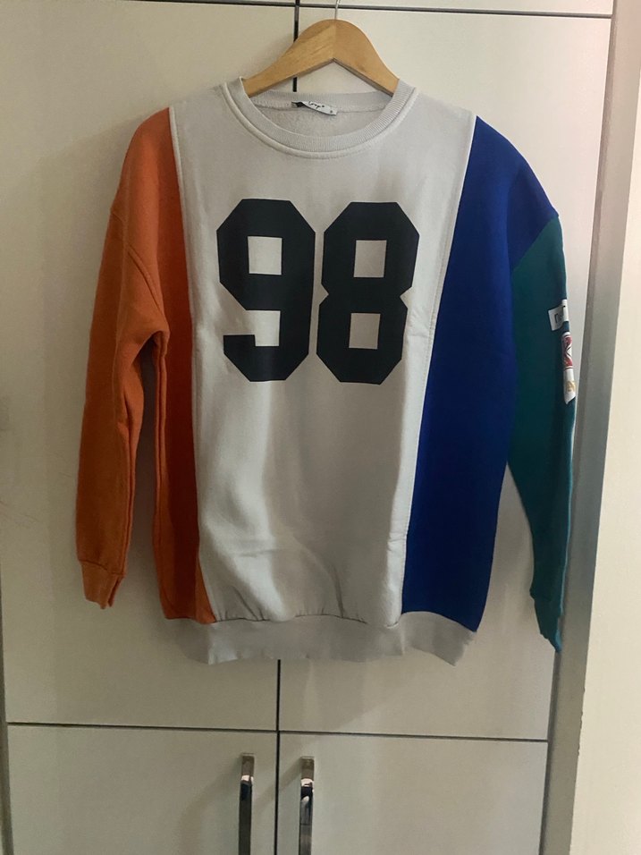 Uzun kollu, yuvarlak yaka, bol kesim kadın sweatshirt. Çok renkli ve baskılı "98" tasarımlı, yumuşak ve sıcak kumaştan.