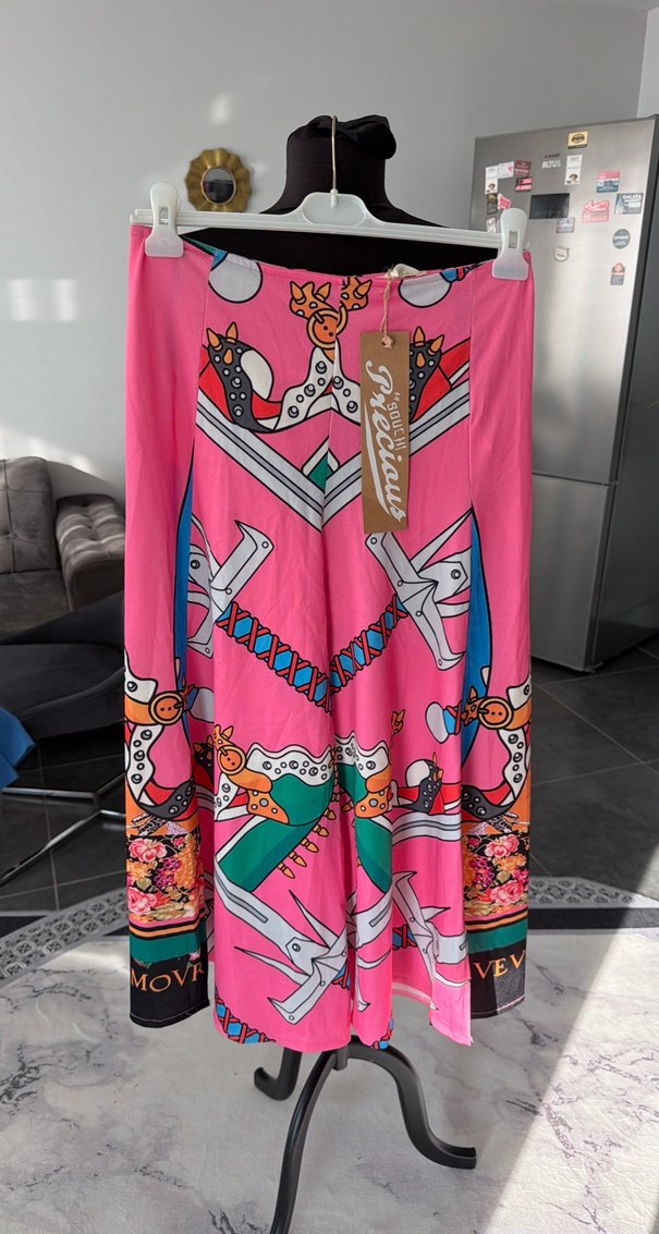 Renkli baskılı, bol kesim ve drapeli uzun pembe kumaş pantolon. Bohem ve retro tarzlardan ilham almıştır, günlük kullanıma uygundur.
