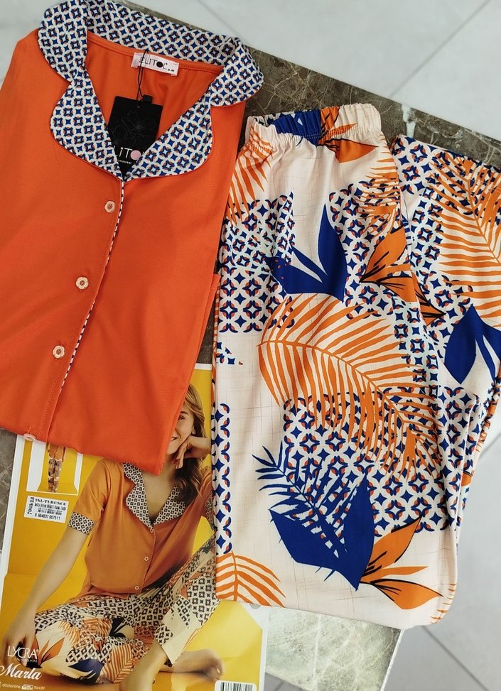 Renkli ve baskılı, kısa kollu, bol kesim mini pijama takımı. Turuncu üst ve retro desenli şort ile rahat ve çağdaş bir tasarım sunar.