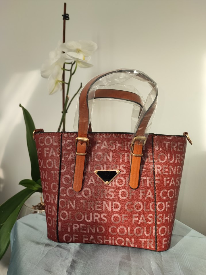 Kahverengi deri çanta, renkli baskılı yazılar ve fermuarlı üst kısmıyla dikkat çekiyor. Paris tarzı, çağdaş ve sağlam saplara sahip.