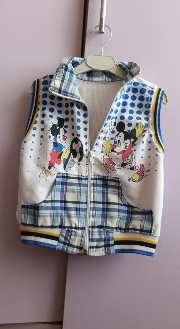 Kapüşonlu ve fermuarlı erkek çocuk yeleği, renkli Mickey Mouse baskılı ve ekose detaylıdır. Sentetik kumaştan, dar kesim ve sokak stili için uygundur. ⚽