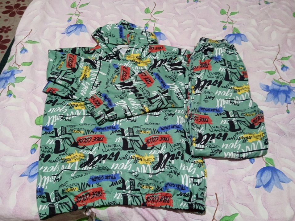 Renkli baskılı, kapüşonlu uzun kollu erkek pijama takımı. Rahat bol kesim ve fermuarlı detaylara sahip kısa boy mini modeldir.