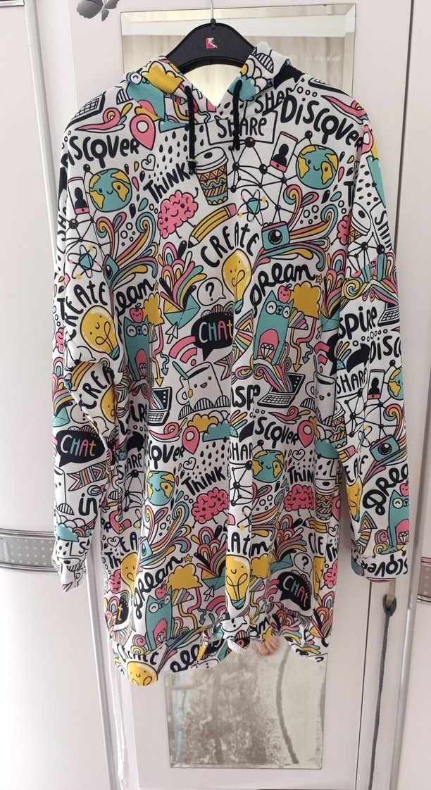Renkli baskılı, kapüşonlu, uzun kollu kadın sweatshirtü, bol kesim ve normal uzunluktadır. Sokak stiline uygun, günlük kullanıma elverişlidir. (giyilmiş, biraz rengi solmuş onun dışında kusıru yok)