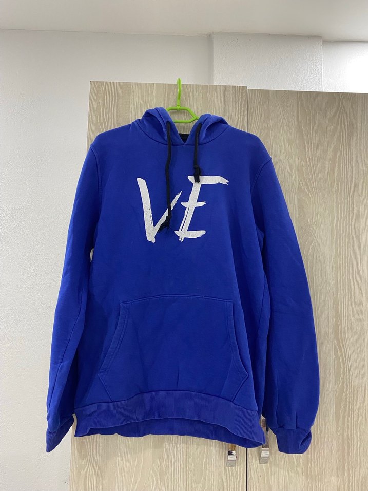 Mavi kapüşonlu sweatshirt, uzun kollu, renkli baskılı, bol kesim ve cırt cırt detaylıdır, rahat sokak stili için uygundur.