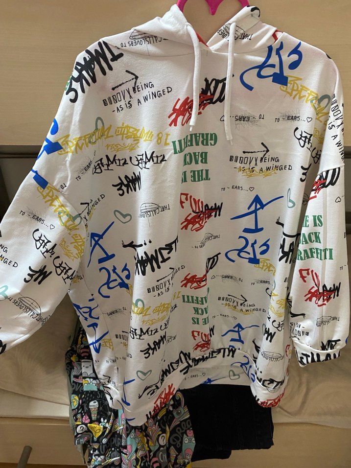 Kadın sweatshirt, bol kesim, uzun kollu ve kapüşonludur. Kısa boyda, tekstil malzemeden yapılmış, renkli grafiti desenleriyle baskılıdır. Trend sokak stili için uygundur. ürün oversize 36 bedendir kusursuzdur