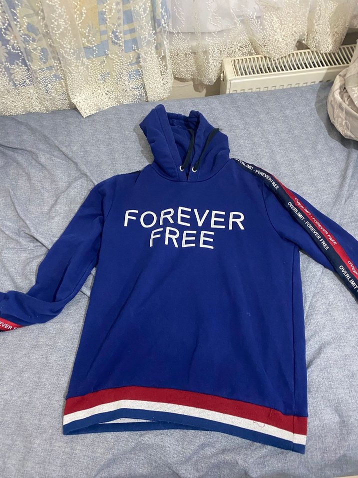 Mavi kapüşonlu sweatshirt, uzun kollu ve bol kesimdir. "FOREVER FREE" baskılı, renkli detaylara ve fermuarlı tasarıma sahiptir. Alt ve kol kenarlarında çizgili detaylar bulunur.