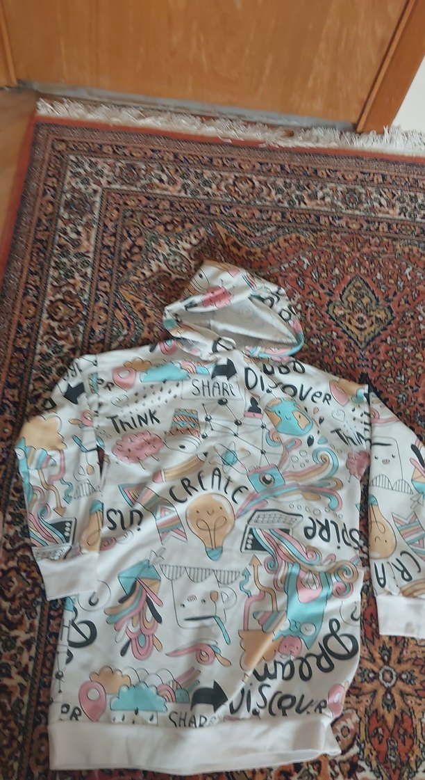 Renkli baskılı, kapüşonlu ve fermuarlı kadın sweatshirtü. Bol kesim ve uzun boy, bohem ve retro sokak stilinden esinlenen tasarım. Günlük kullanım için uygundur. L/XL 42/44 beden
