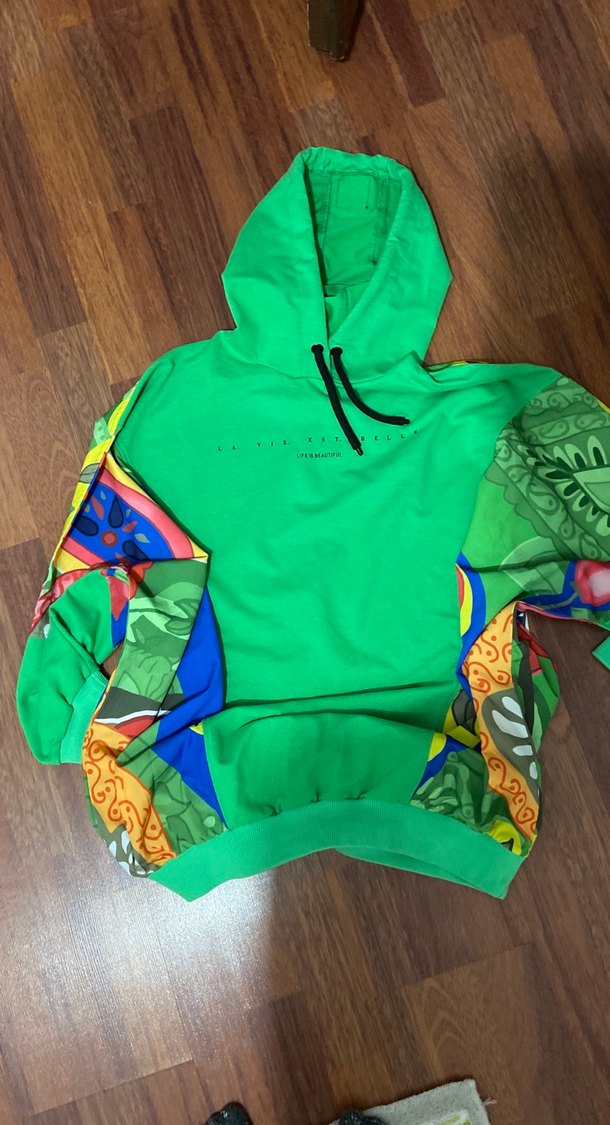 Renkli Baskılı Kapüşonlu Yeşil Sweatshirt