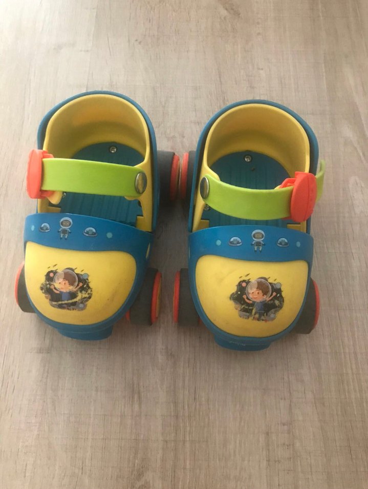 Renkli baskılı desenli erkek bebek alıştırma pateni. Oğlum 2 yaşındayken almıştım 1 yıla yakın kullandık temiz ürün herhangi bir problemi yok yurt dışından almıştım 25-27 numaraya uygun