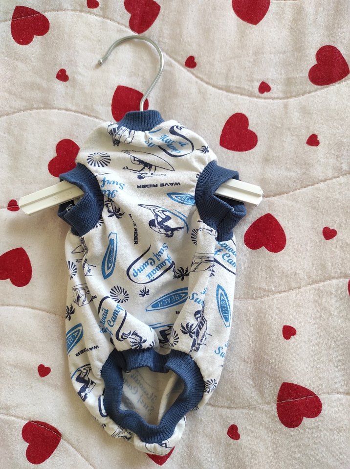 Renkli baskılı, mavi detaylı rahat kedi kıyafeti.