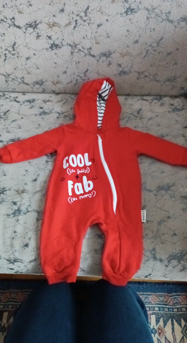Renkli baskılı kırmızı bebek tulumu, fermuarlı ve kapüşonludur. Yumuşak ve sıcak kumaştan üretilmiştir.