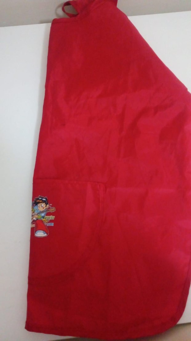 kırmızı renkli boya önlüğü ön cebinde renkli baskılı desenle dikkat çeker. Kullanışlı ve canlıdır.