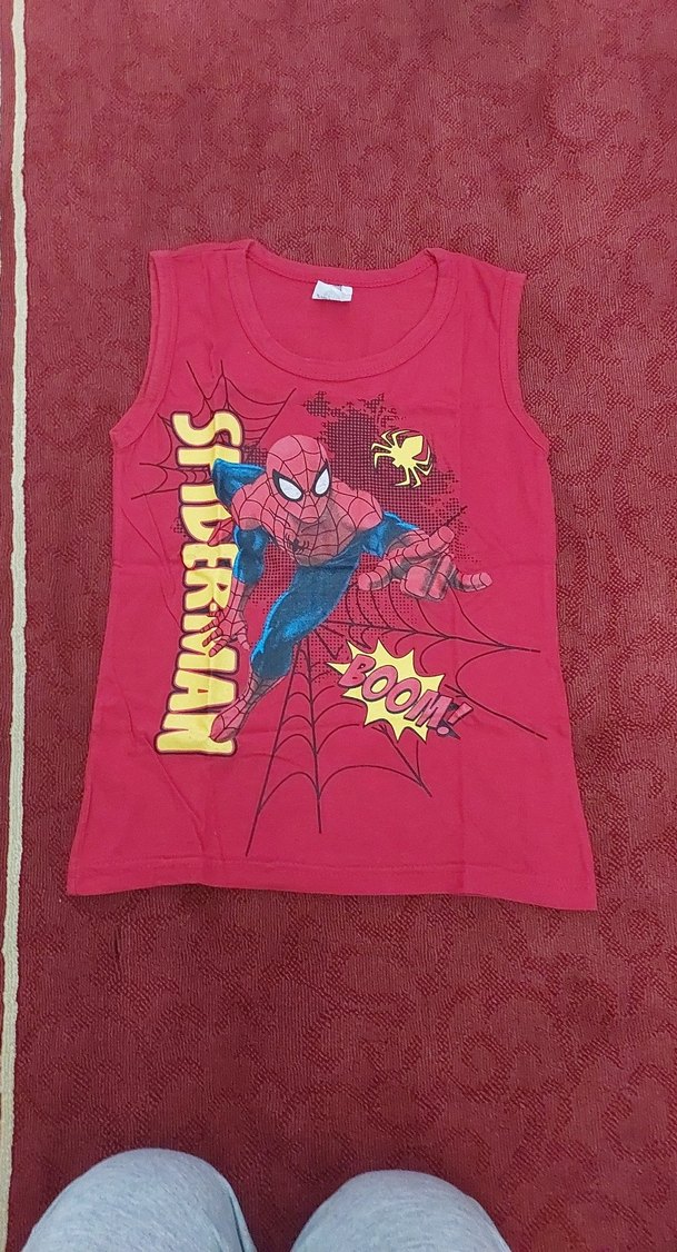 Renkli baskılı, kirmizi renkte çocuklar için kolsuz atlet. Üzerinde 'SIIDERIMAN' yazısı ve süper kahraman figürü bulunur. ️ 1 kere kullanildi