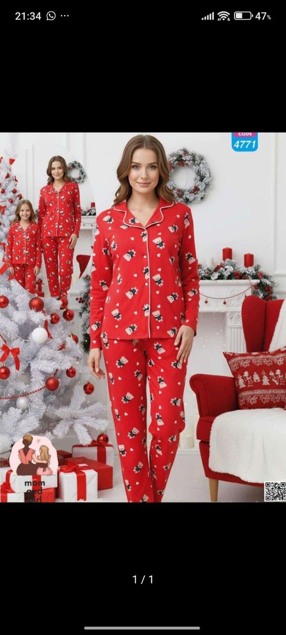 Uzun kollu, normal boyda ve renkli baskılı kırmızı kadın pijama takımı, rahat kesimiyle konfor sunar.