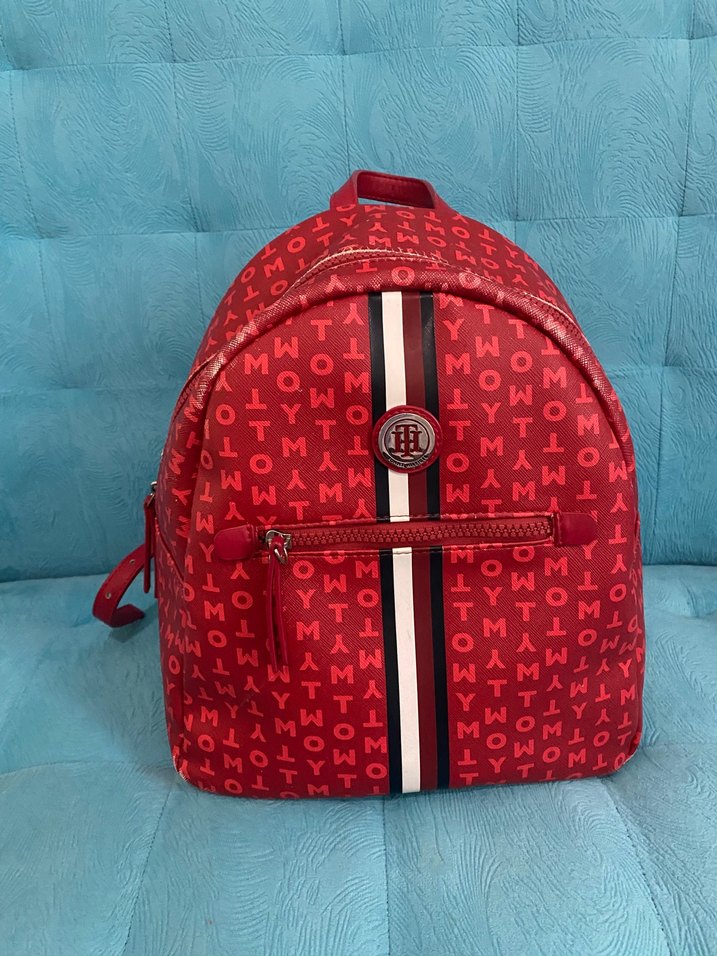 Kırmızı, baskılı ve renkli desenli kadın sırt çantasıdır. Sentetik kumaştan, tokalı ve trend casual athleisure tarzına uygundur. Tommy Hilgifer sırt çantası,Amerika’dan aldım.İçi oldukça geniş.Yıpranmış olan yerlerinin fotoğrafını ekledim.
