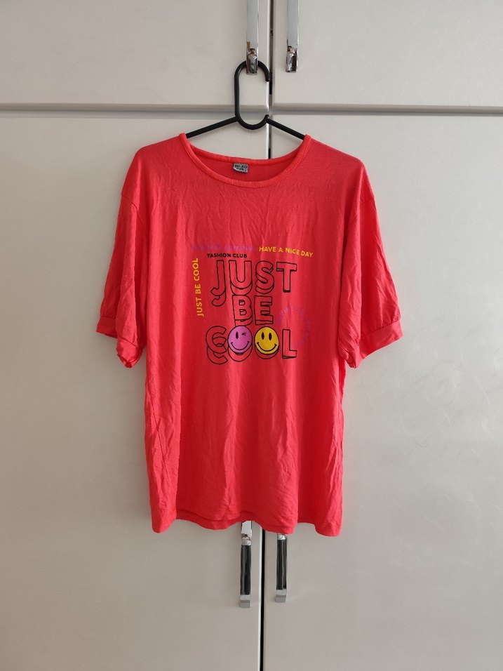 Renkli baskılı kırmızı pamuk tişört, kısa kollu, yuvarlak yaka ve bol kesimdir. Günlük rahat sokak giyimi için idealdir.