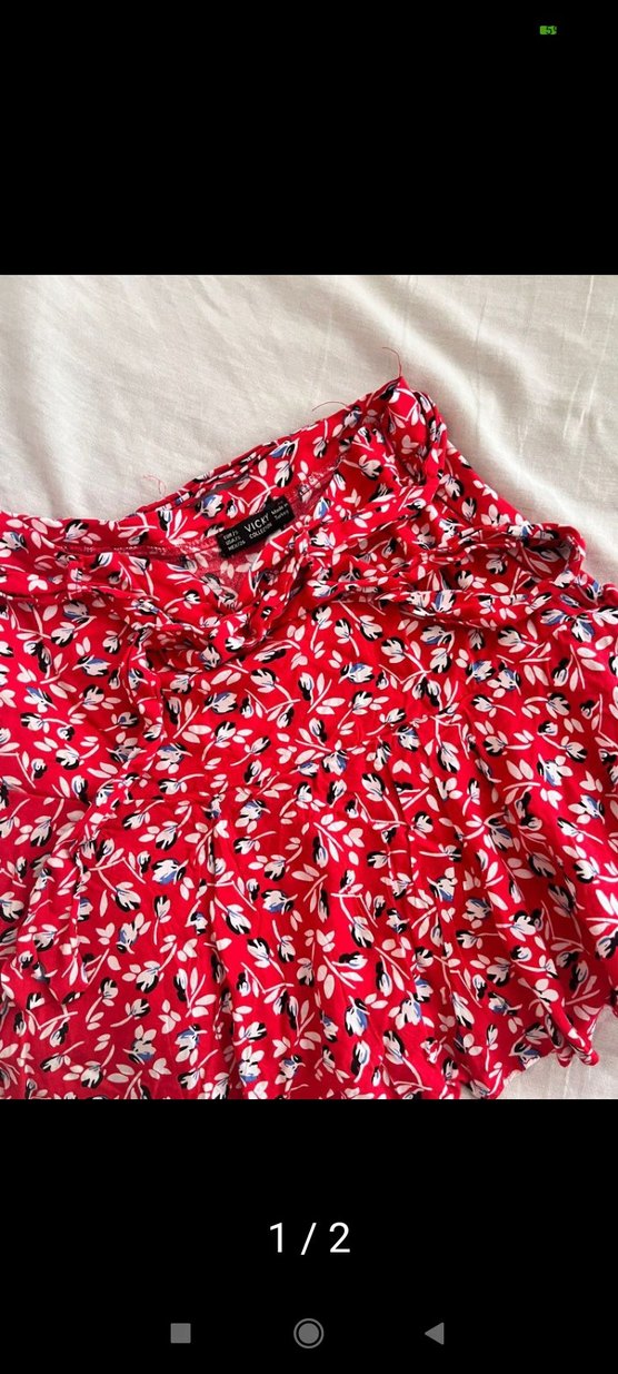 Renkli baskılı, kırmızı mini etek, bol kesim ve fırfır detaylı. Sentetik kumaştan, sokak stili ve günlük kullanım için uygun.