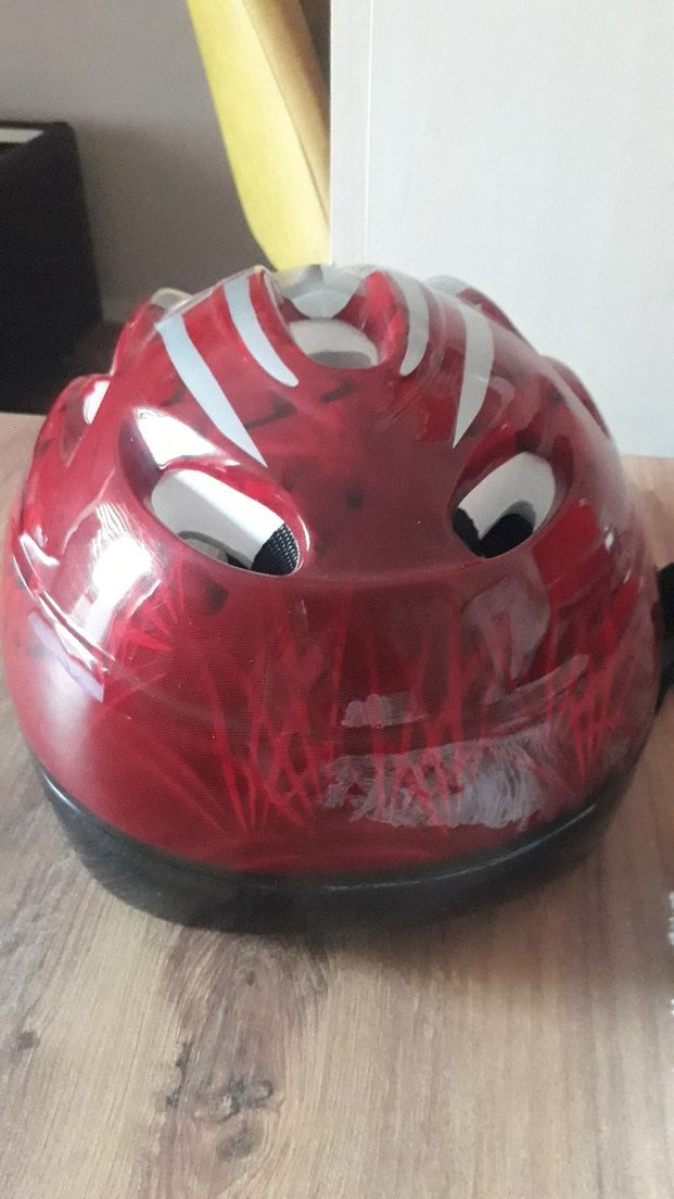 Dayanıklı plastikten yapılmış, renkli baskılı kırmızı motosiklet kaskı. Tokalı kapanışı ve grunge punk tarzı ile rock punk havası yaratır. ️