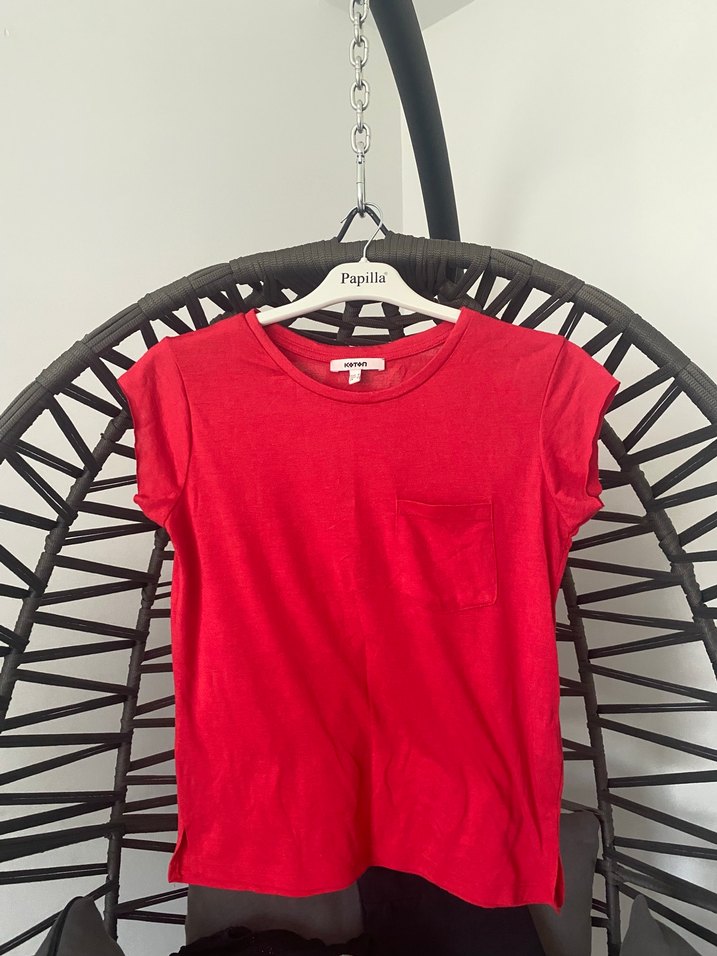 Pamuklu kumaştan, renkli baskılı kırmızı tişört. Salaş kesim, yuvarlak yaka ve kısa kolludur. Önünde küçük cep bulunur.