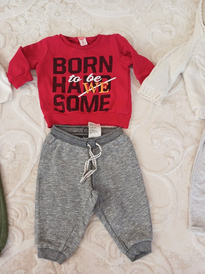 Kırmızı uzun kollu, baskılı sweatshirt ve örme gri pantolondan oluşan renkli bebek takımı. Yumuşak ve sıcak kumaş rahatlık sağlar.