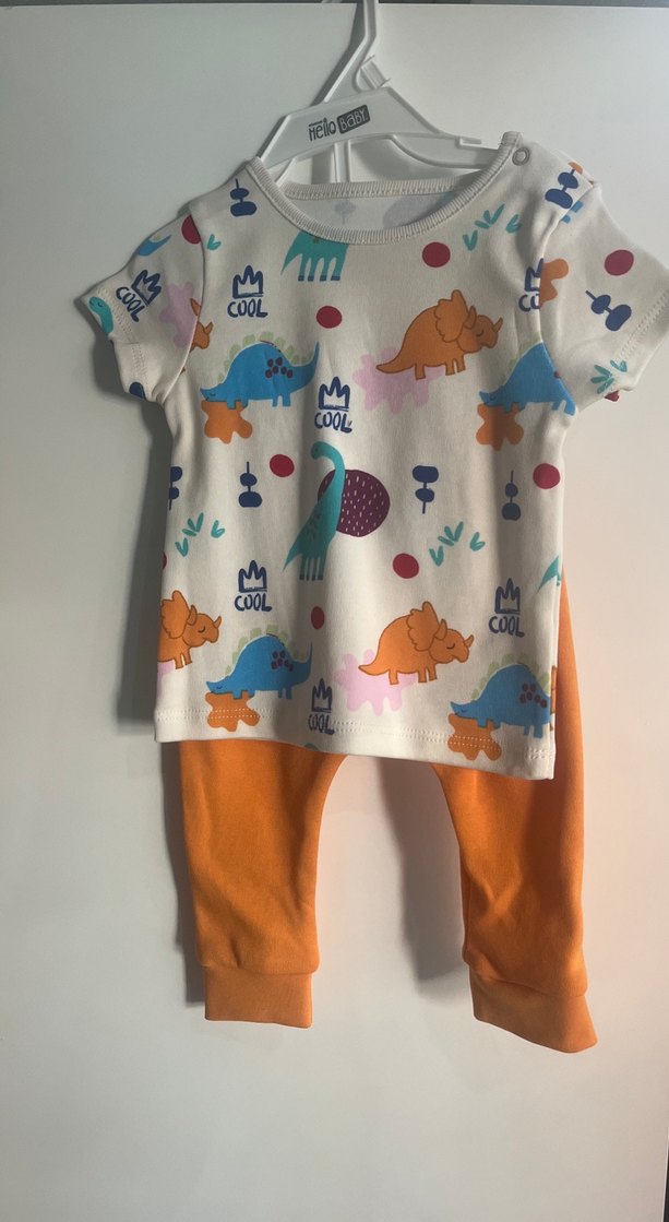 Pamuklu, kısa kollu, renkli dinozor baskılı tişört ve turuncu pantolondan oluşan bebek takımı. Tişört yuvarlak yakalıdır.