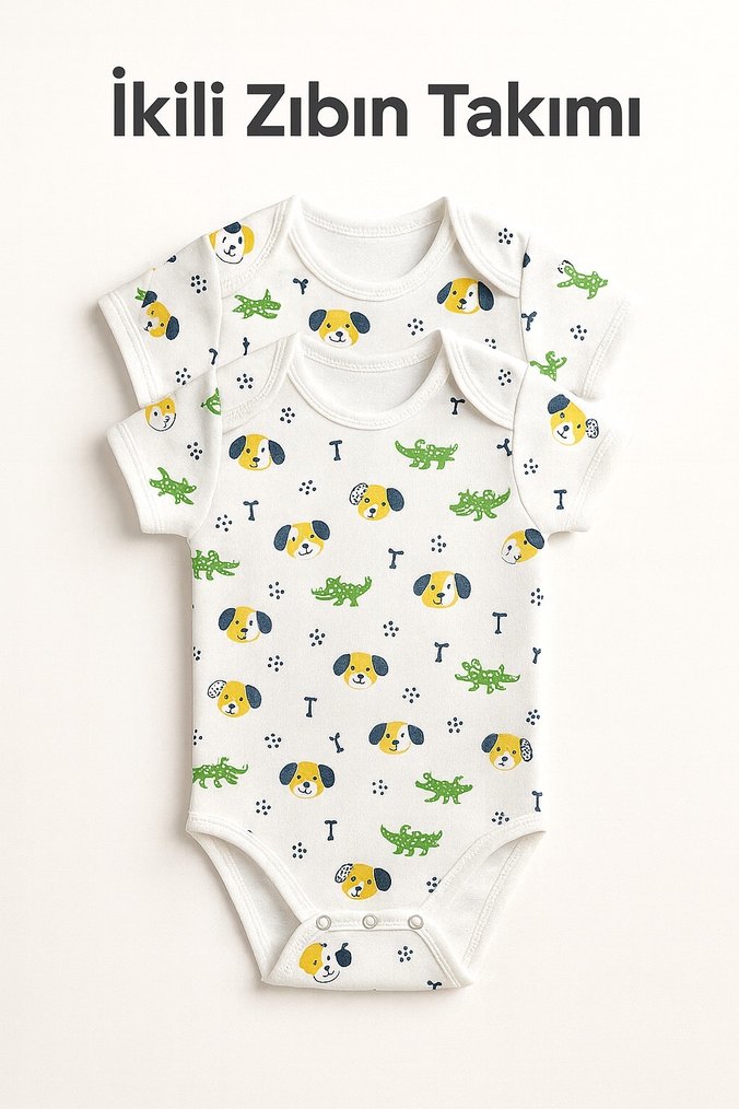 Renkli baskılı, kısa kollu ve yuvarlak yaka bebek zıbın takımı. Pamuklu ve dantel detaylı, rahat ve sevimli tasarım.