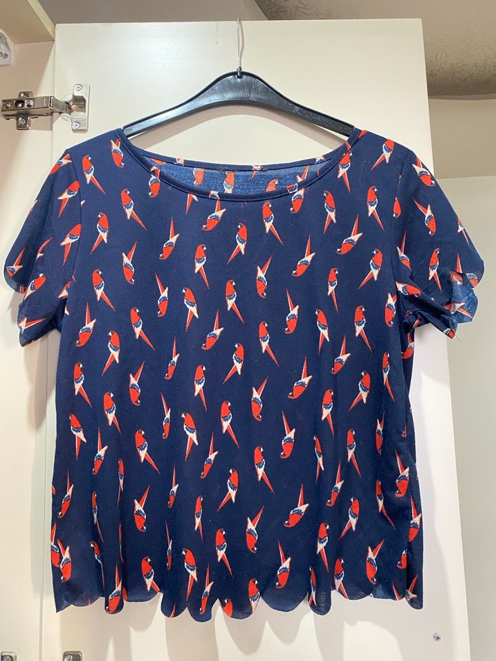 Renkli kuş desenli, mavi zeminli bol kesim bluz. Kısa kollu, yuvarlak yaka ve pileli etek ucu detaylarına sahiptir. Günlük kullanım için uygundur.
