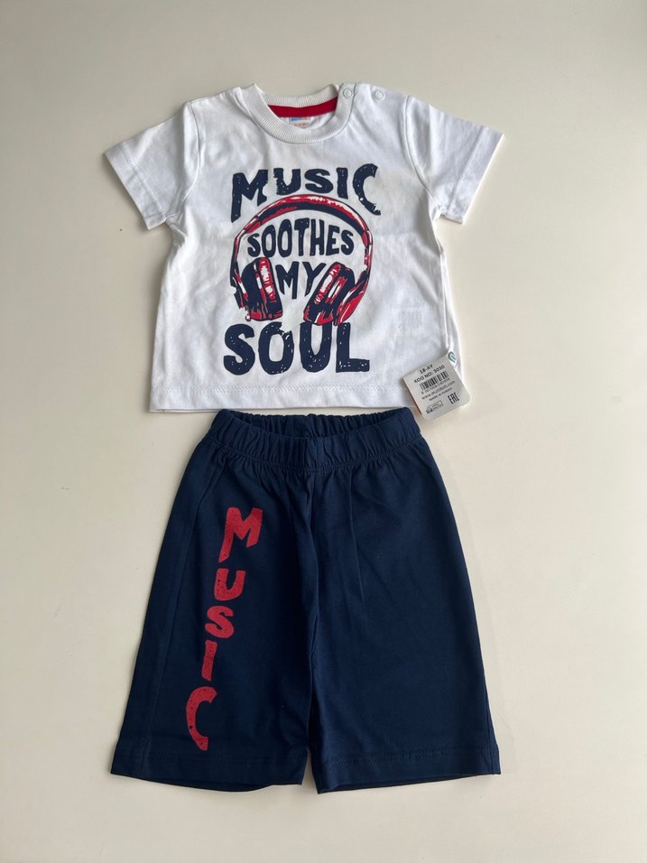9-12 aydır Pamuklu, kısa kollu, baskılı, düğmeli beyaz tişört ve üzerinde 'Music' yazılı lacivert şorttan oluşan renkli erkek bebek takımı. #erkekbebek #şorttakım