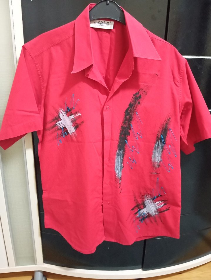 Kısa kollu, renkli baskılı kırmızı erkek gömlek. Notlu yaka, düğmeli, sentetik kumaştan, bol kesim ve kısa boyda, sokak stiline uygun.