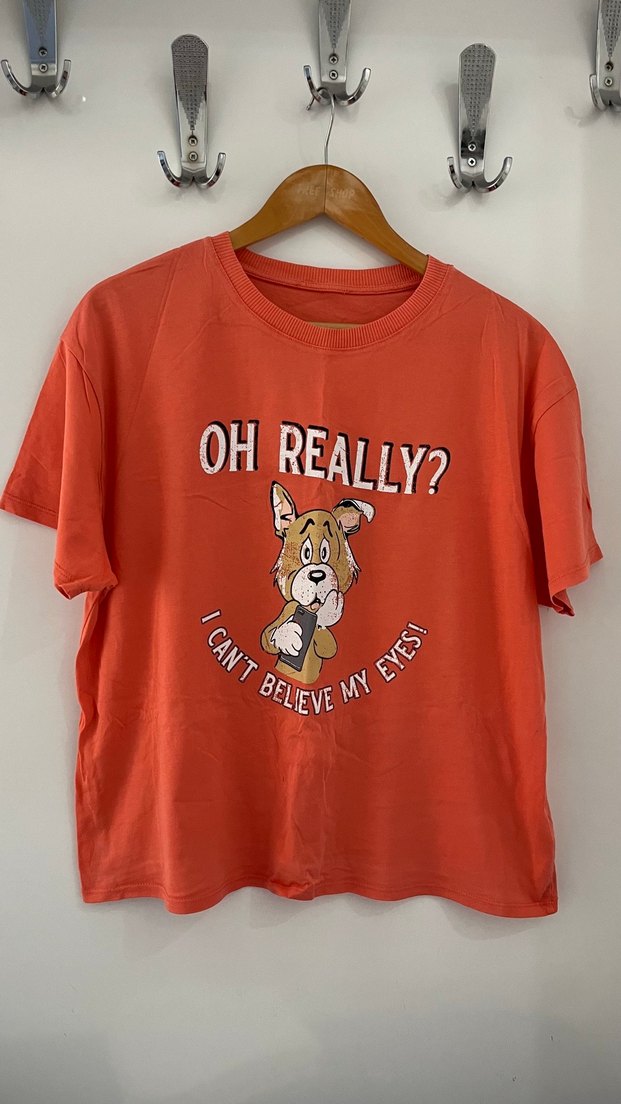 Pamuklu, renkli baskılı, kısa kollu ve oversize kesim kadın tişört. 'OH REALLY? I CAN'T BELIEVE MY EYES!' yazılı sevimli köpek baskısı ve tokalı detay içerir.