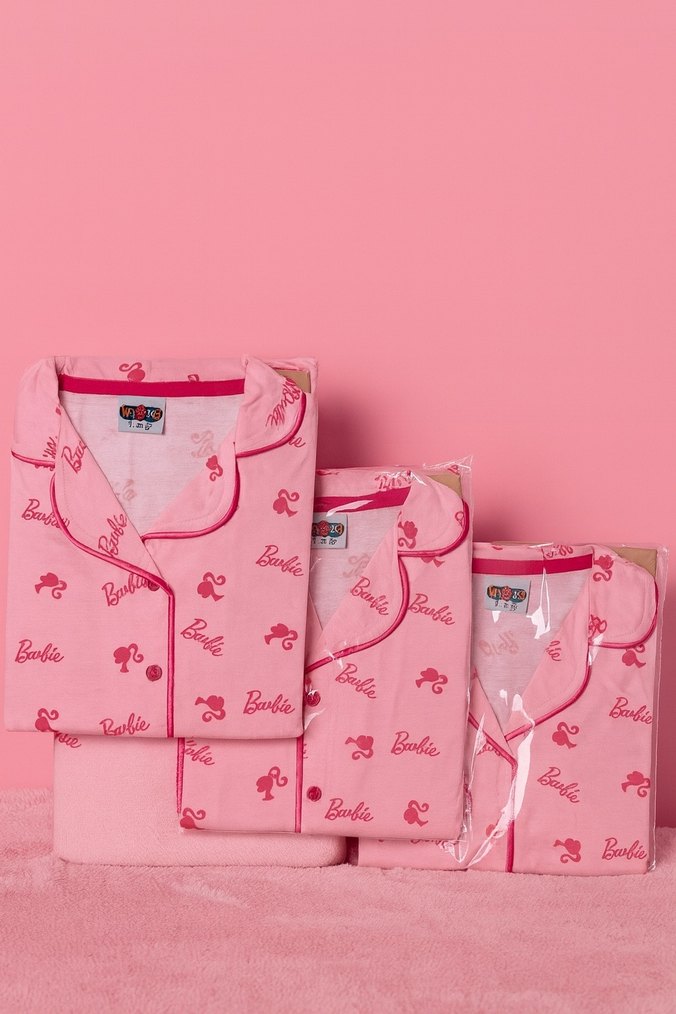 Renkli baskılı Barbie desenli pembe kadın pijama takımı, kısa kollu, mini boy ve rahat kesime sahiptir. Sokak tarzı ve konforlu bir uyku deneyimi sunar.5-12 yaş arası mevcut