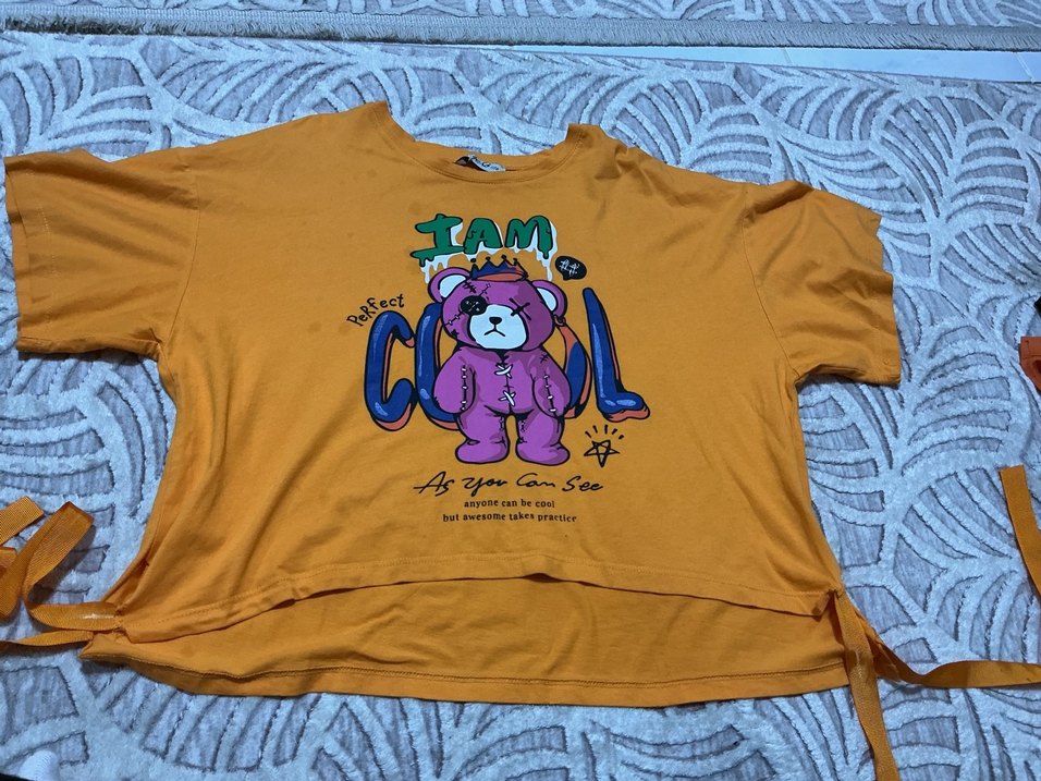 Pamuklu, , bol kesim, bisiklet yaka tişört. Üzerinde renkli ayı ve yazılı baskı bulunur. Trendy, rahat sokak stili için uygundur. Lekeler mevcuttur, iplerde hasar vardır kullanıma engel değildir.
