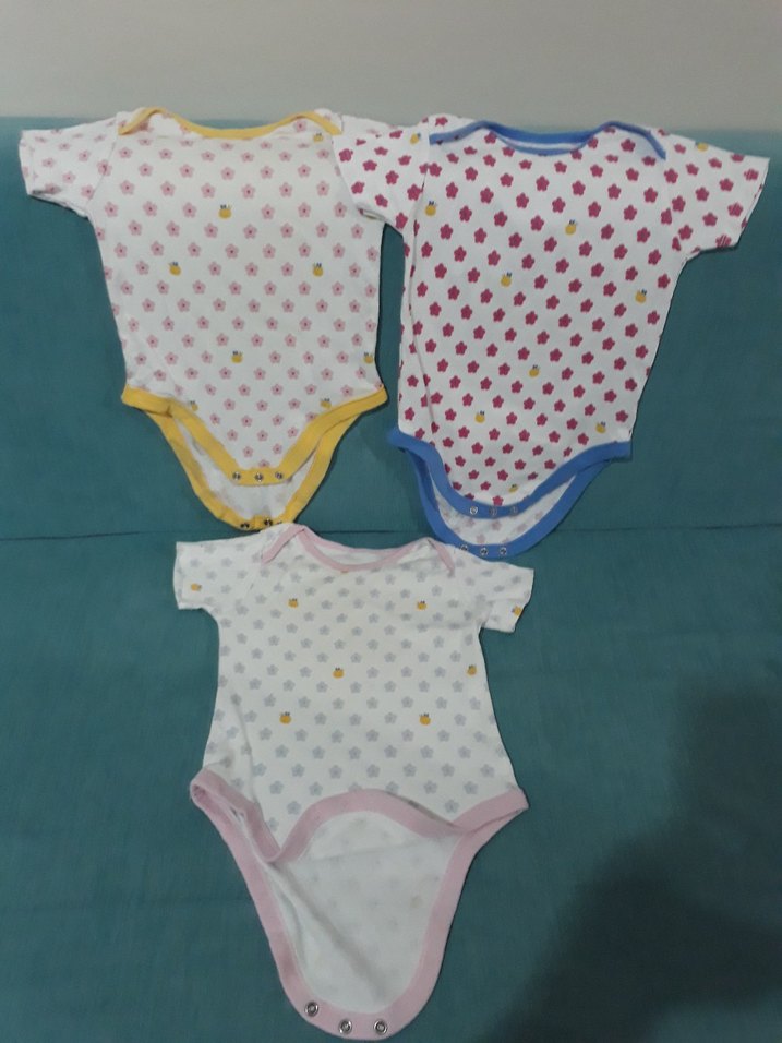 V yaka, düğmeli, renkli baskılı kız bebek body seti. Sarı, mavi ve pembe kenar detaylı, kısa kollu üçlü set.