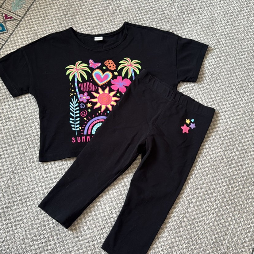 Kısa kollu üst ve baskılı pantolondan oluşan renkli kız bebek takımı. Üstte tropikal ve kalp desenleri, pantolonda küçük yıldız baskıları bulunur.