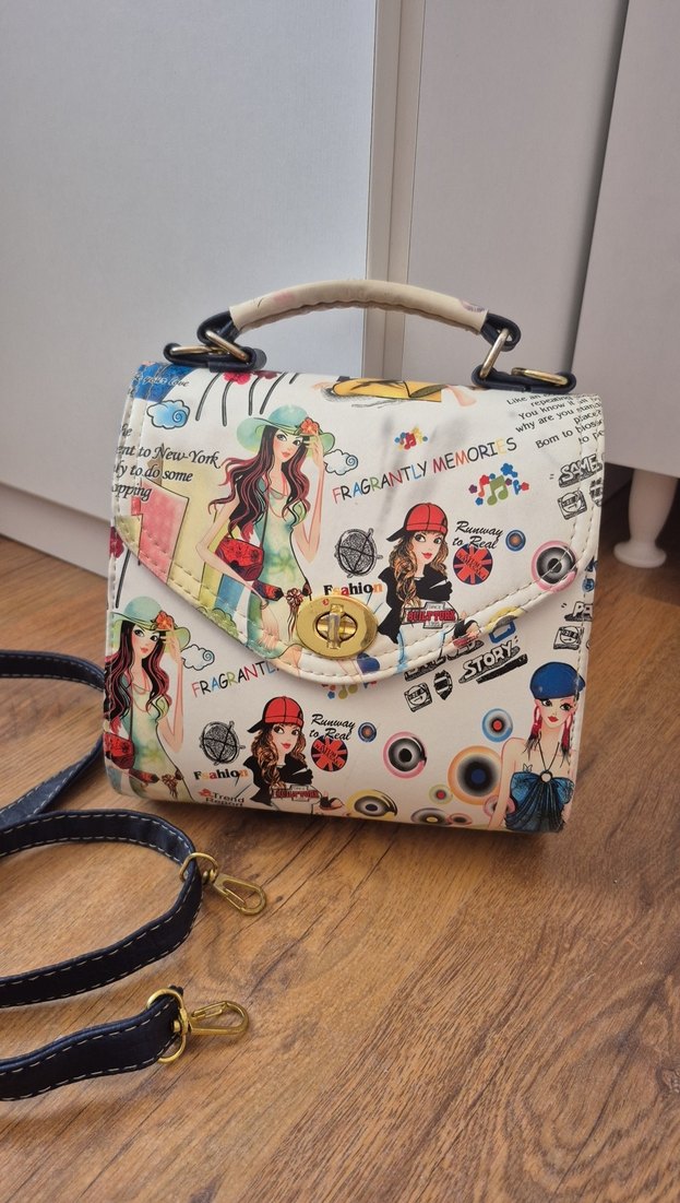Renkli baskılı kız çocuk çantası. Küçuk renk kusurları vardır fotoğrafta gösterdim. Askısının bir tarafı açılmış. Yapışacağını düşünüyorum. İçine askısını da koyacağım.