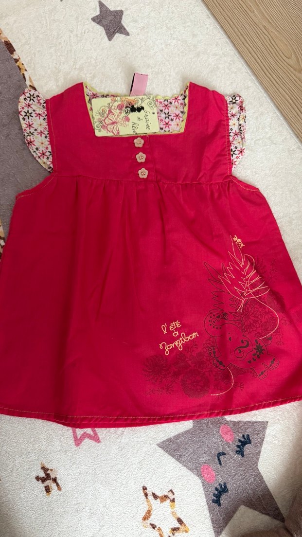 Renkli baskılı, düğmeli ve askısız yakalı, salaş kesim kız çocuk elbisesi. Bohem tarzını yansıtır.