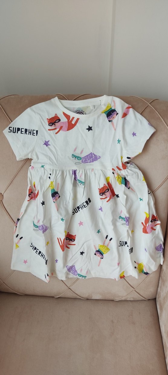 Renkli baskılı, kısa kollu, yuvarlak yakalı ve bol kesimli kız çocuk elbisesi. Yumuşak kumaştan, Trendy günlük stil için uygundur.
