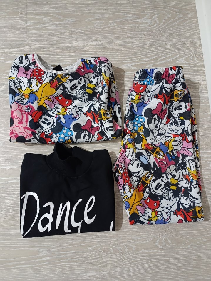 Renkli baskılı, bol kesim kız çocuk eşofman takımı. Üst kısa kollu ve yuvarlak yaka, siyah sweatshirt üzerinde "Dance" yazısı var. Sentetik kumaştan, trend sokak stili için uygun.
