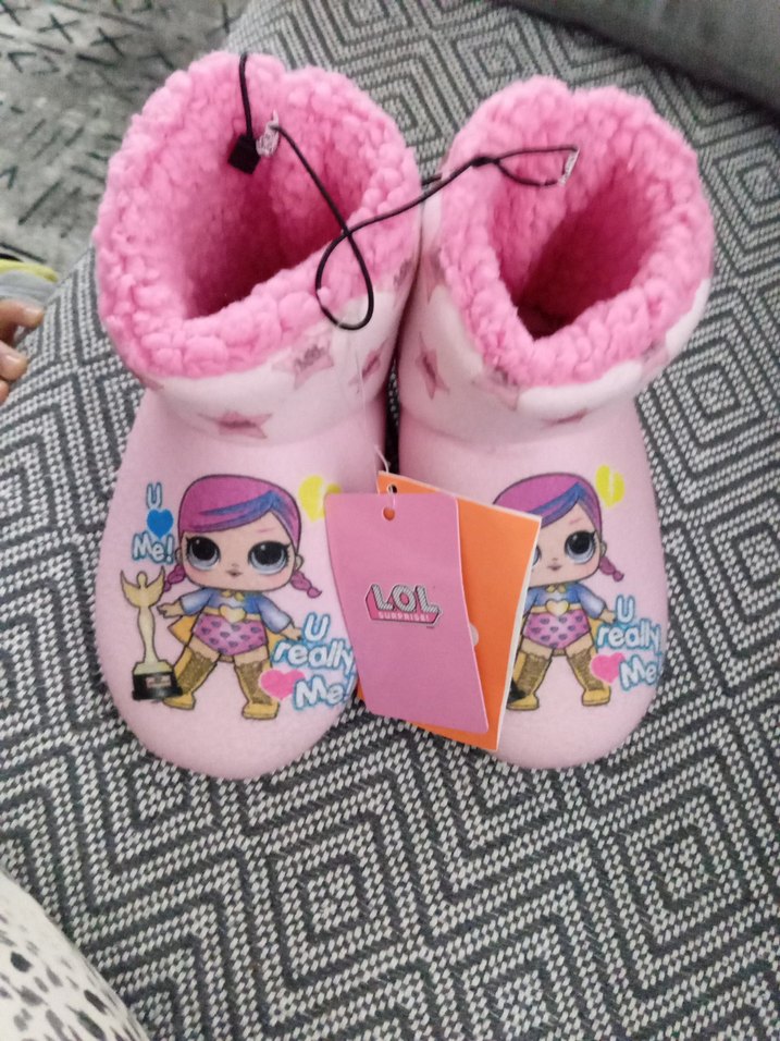 Pembe, yumuşak ve sıcak kürklü iç yüzeye sahip, renkli örgü ve pop kültür baskılı kız çocuk ev terliği.