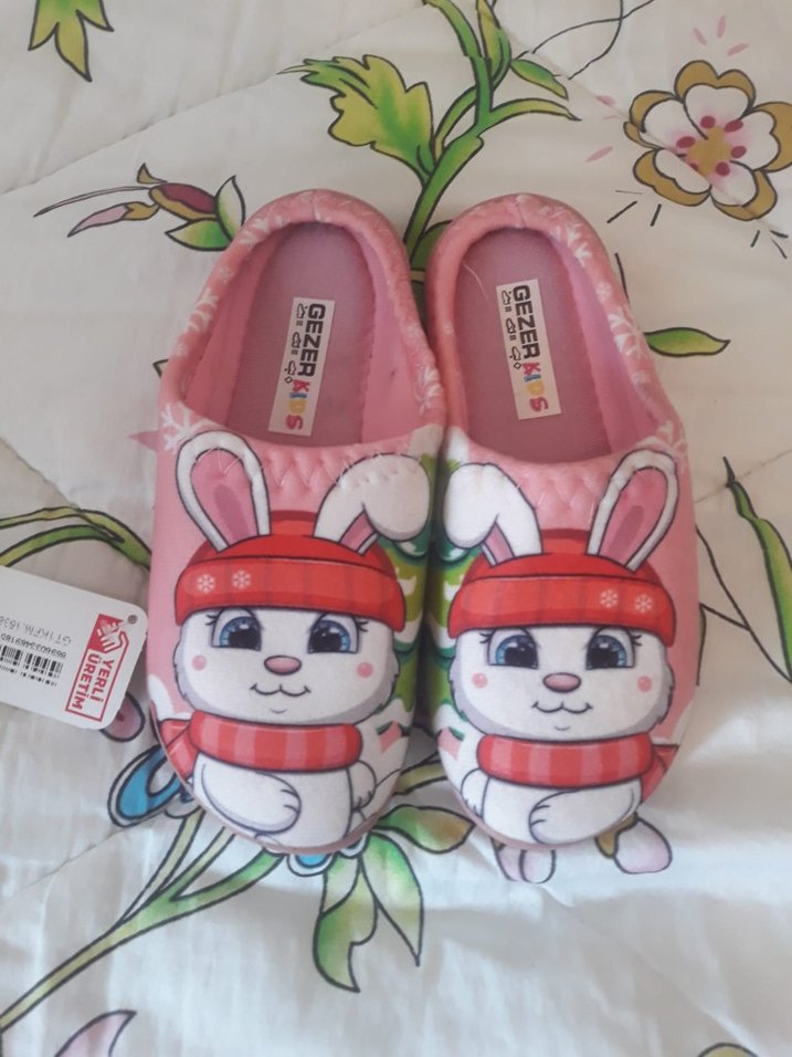 Renkli baskılı ve örme detaylı, kauçuk tabanlı kız çocuk terliği. Sıcak tutar ve günlük şık sokak stili için uygundur. Üzerinde 'GEZER' markası bulunur.