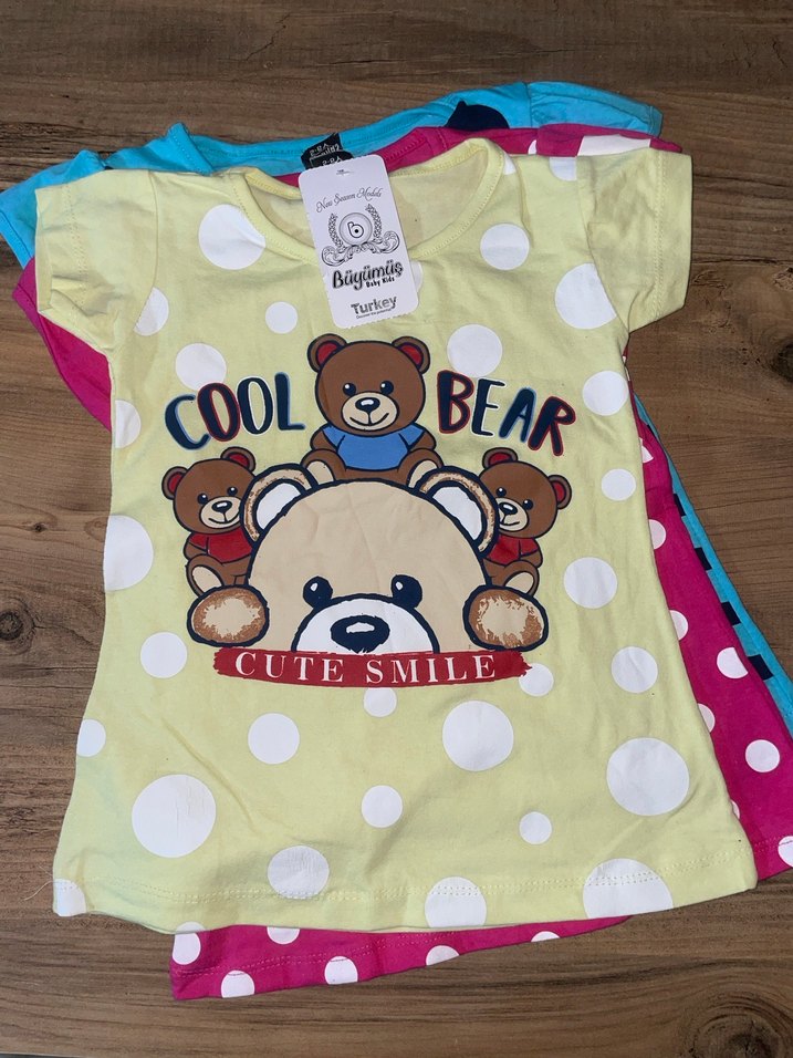 Pamuklu, renkli baskılı, kısa kollu, düğmeli ve bol kesim kız çocuk tişörtü. Rahat ve şık bir sokak stili için uygundur. 4-5 yaş.