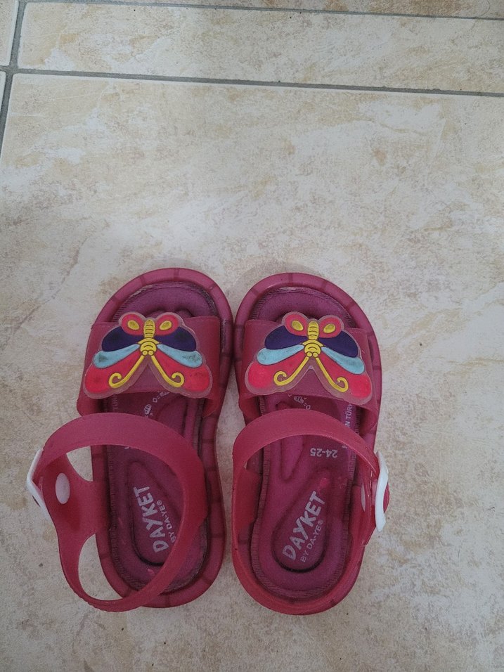 Pembe renkli kauçuk kız çocuk sandaletleri, renkli kelebek baskıları ve ayarlanabilir tokalarla bohem tarzı sunar.